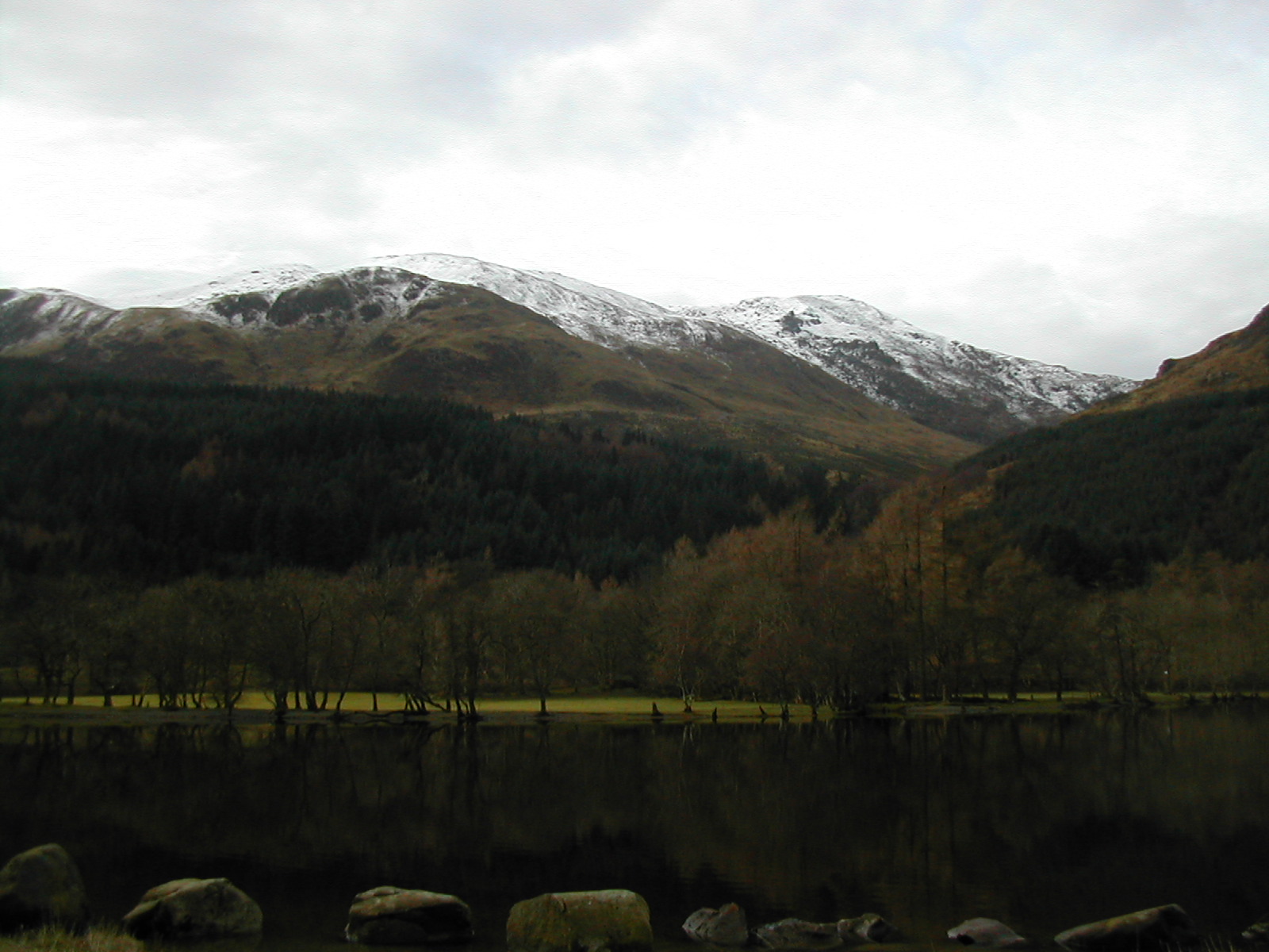 View over Loch Lubnaig at the foot of the snowy ben slopes